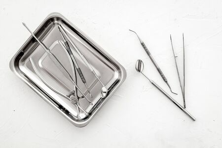 Stomatological tools on dentists desk on white background top-down frame copy space