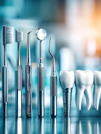 Various dental instruments are meticulously arranged beside a detailed tooth implant, emphasizing precision and care in dental procedures at a contemporary clinic.
