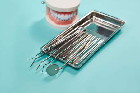 Jaw cast and dental steel tools lying on a blue background. Toothcare, dental health concept.