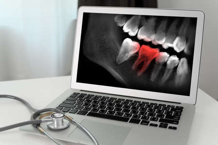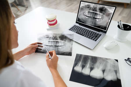 Dentist dental tool to teeth x-ray work Looking At Teeth X-ray On Computer