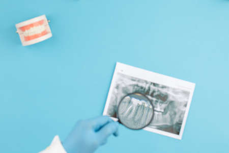 Dentist tools and artificial jaw on a blue background. The concept of dental care and going to dentistry.