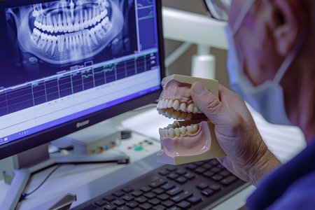 Dentist examining a 3D printed teeth model while looking at a computer screen.