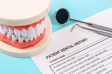 Dental history form with model tooth and dental instruments. Dental health and teeth care concept.