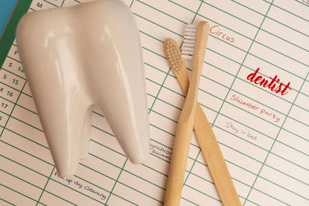 Oral care concept - tooth with toothbrushes over background with scheduled dentist visit