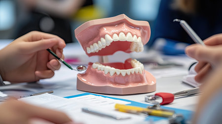 This image captures a hands-on educational setup featuring a dental model, tools, and engaged learners, ideal for discussions on oral health and dental hygiene training.