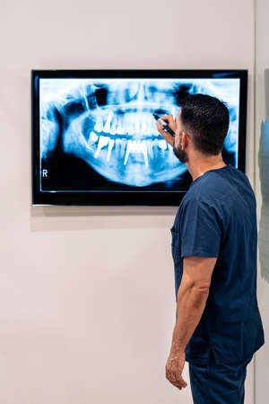 Before treatment, dentist examines an X-ray of the patient jaw on digital tablet