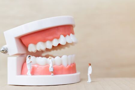 Miniature people : Dentist observing and discussing about human teeth with gums