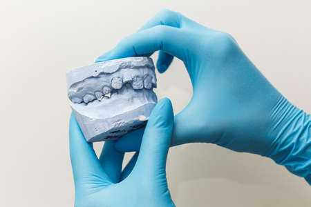dentist examines artificial dental crowns on a model in his office