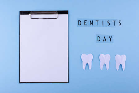 Teeth models standing in a row making a smile on a blue background. dental banner background. Healthy, strong snow-white teeth. World Dentist Day. International Oral Health