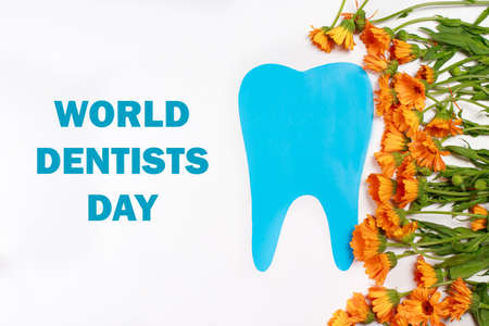 Greeting card for dentistry. Blue tooth and calendula flowers with text World dentists day