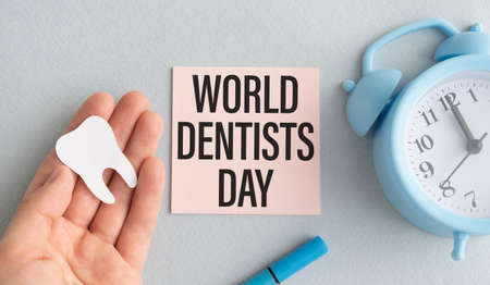 Greeting card for dentistry. Blue tooth and rose flower with text World dentist day on white.
