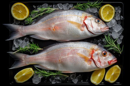 Fresh fish on ice with lemon and rosemary on black background.