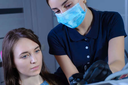 Pretty young female dentist making examination and treatment for young female patient in dental clinic