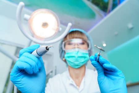 Dentist in a surgical mask, holding an angle mirror and a drill, ready to work. Woman dentist at work. Makes an examination and treatment of teeth for caries.
