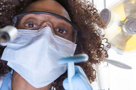 Female dentist wearing face mask and dental magnifying glasses doing treatment to unrecognized patient.