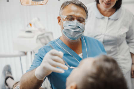 Dentist and assistant at a treatment, from the perspective of a patient. Dentist Holding Dental Tools.