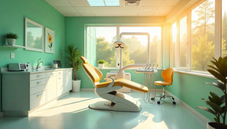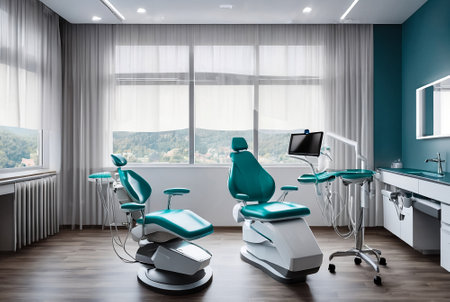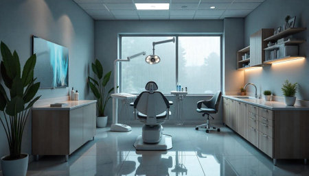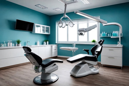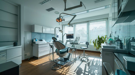 Modern dental office interior with chair and equipment.