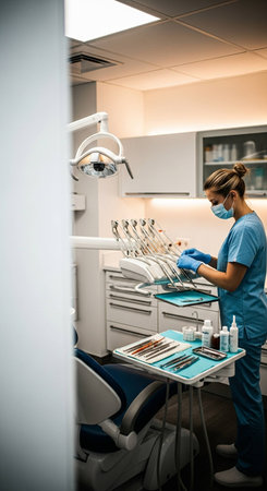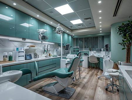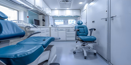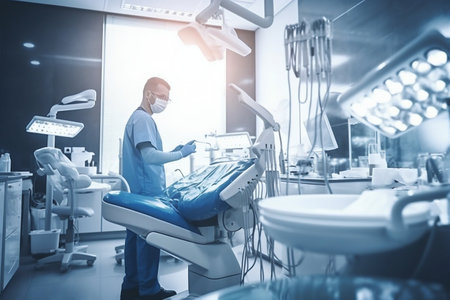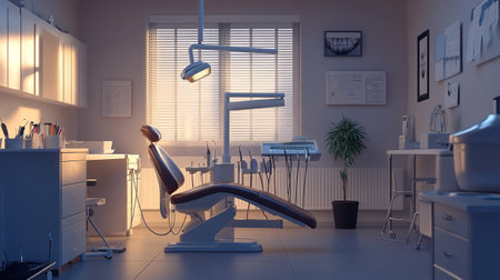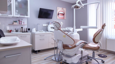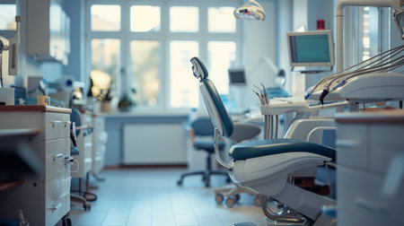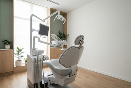 Dentist's office showing equipment, chair, and medical devices in a clean, modern setting, ready for patients