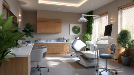 This image showcases a modern dental office featuring sleek designs, ample natural light, and vibrant indoor plants, creating a welcoming and calming environment for patients.