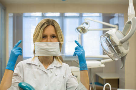 Female dentist doctor shows how to put on a surgical mask or sterile procedure mask on his face in dental office. Laboratory equipment, medicine and science, stomatology and healthcare concept.
