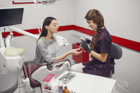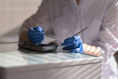 Dental instruments in the hands of a dentist woman close-up.