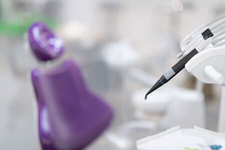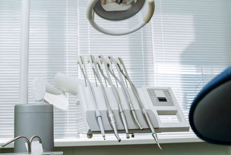 Dental equipment in the dentist's office in a new modern dental clinic. Dental chair and accessories used by dentists