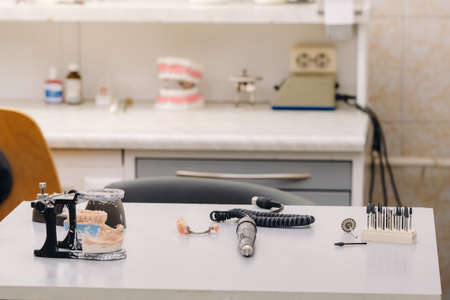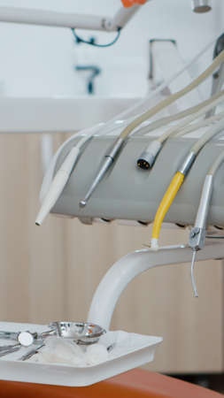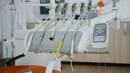 Close up of medical stomatology equipment in modern bright office, orthodontic drill and other professional dental health teethcare instruments. Dentistry cabinet with dental orthodontist tools