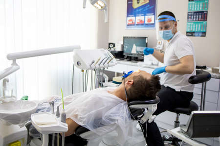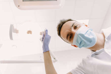 Professional dental doctor is working in office. The dentist holds a dental lamp in order to examine the patient. The concept of an appointment with a doctor in a clinic.