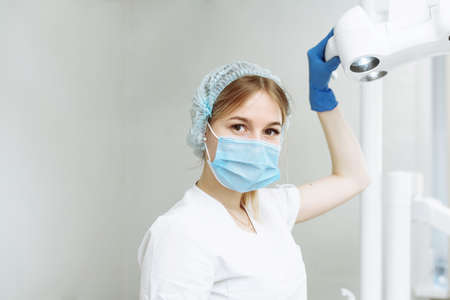 Portrait of young female dentist wearing surgical mask while holding a dental lamp.