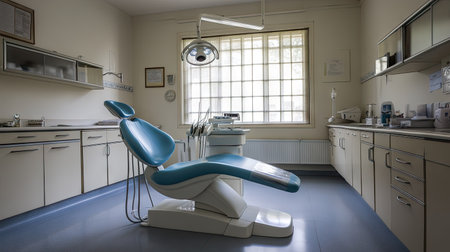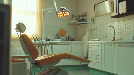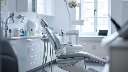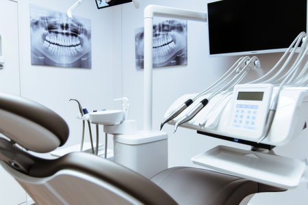 Dental chair and instruments arranged in a bright, sterile clinic room, highlighting a clean, professional setup, ready for patients.