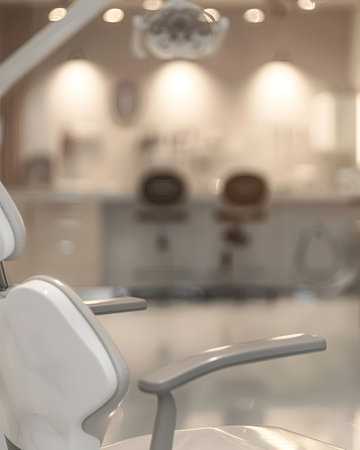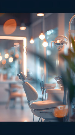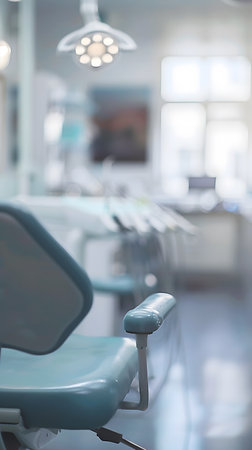 A dental office scene featuring a dental chair and a blurred background of equipment.