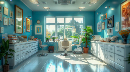 Modern Dentist Office Interior with Retro Design and Mint Green Flooring, Relaxing Atmosphere