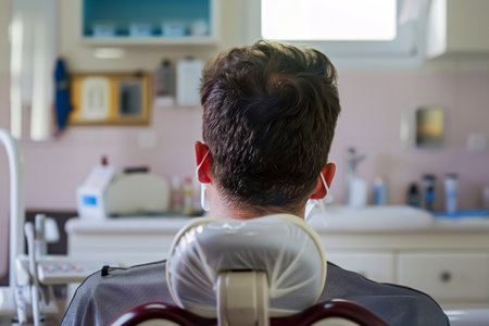 Back view of a young male patient sitting in a dental chair.