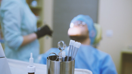 Doctor and patient in the dental office, examination the mouth, medical instruments in the foreground
