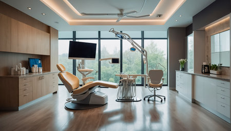 A dental treatment room in a luxury clinic, with advanced equipment, stylish furnishings, and a serene color palette, emphasizes the clinic's commitment to excellence and patient care