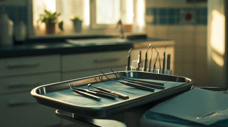 Dentist tools on a metal tray in a modern dental clinic