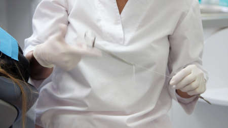 Dental instruments in the hands of a dentist woman close-up.