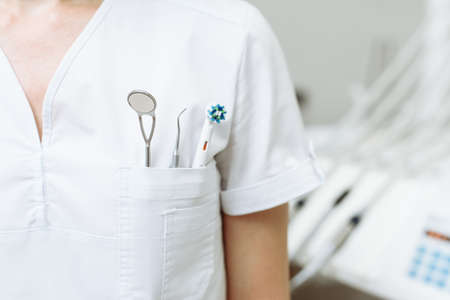Female dentist with tools. A young doctor stands in a dental office. Concept of attending dentist, dental care and going to the dental clinic.