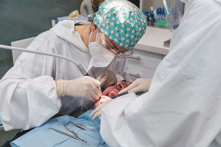 Closeup photo shoot of process of dental operation over small boy by expirienced dentist.