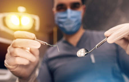 Selective focus on the young dentist wearing medical mask and gloves holding some dental instruments in her hands wanted to examine her patient
