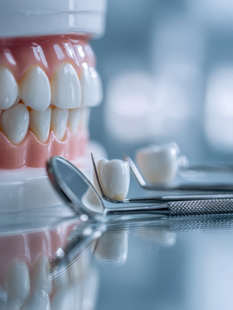 A detailed shot showing a dental practitioner's workspace, featuring a realistic teeth replica and precise instruments reflected on a glossy surface, emphasizing clinical hygien