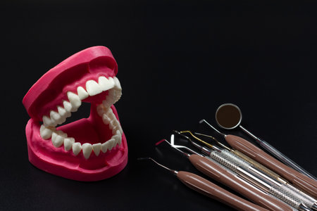 Layout of the human jaw with the mouth mirror and the dental restoration instruments on the black background. Medical tools.