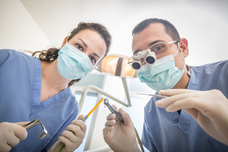 Dentist and assistant at a treatment, from the perspective of a patient. Dentist Holding Dental Tools.