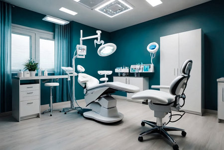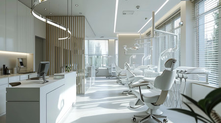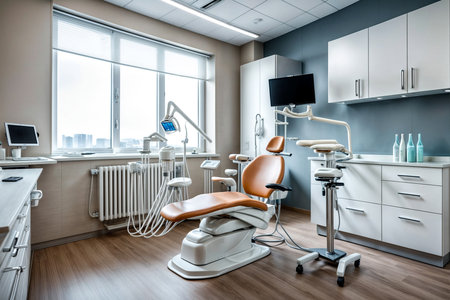 Modern dental clinic interior with equipment and natural light