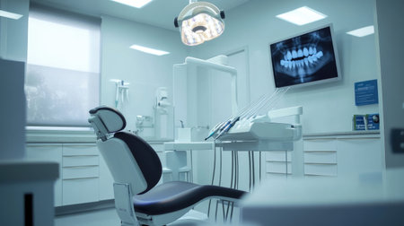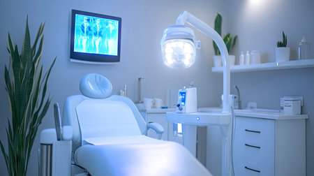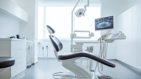 Modern dental clinic interior with treatment chair and X-ray display in bright environment