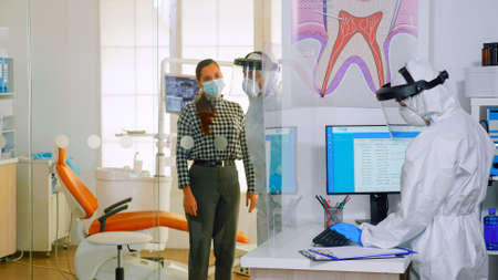Doctor with protection suit inviting next patient in stomatology room for teeth examination during coronavirus. Assistant and dentist medic wearing overall, face shield, mask, gloves in dental clinic