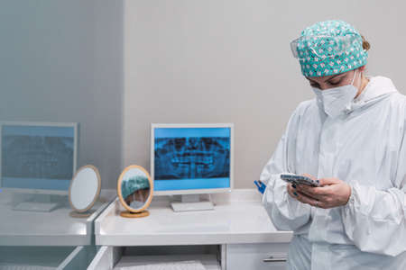 Woman dentist with a smart phone in her hands in the dental office