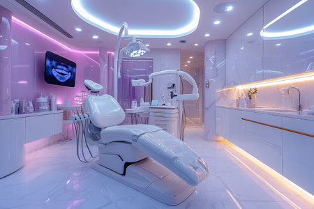 A modern dental clinic interior featuring a dental chair and ambient lighting.
