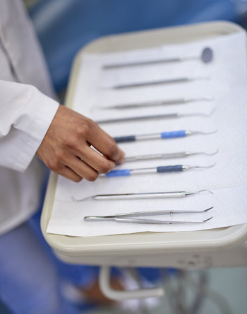 Lining up dental tools on a tray. Closeup shot of an unrecognisable dentist working with a tray of surgical instruments.
