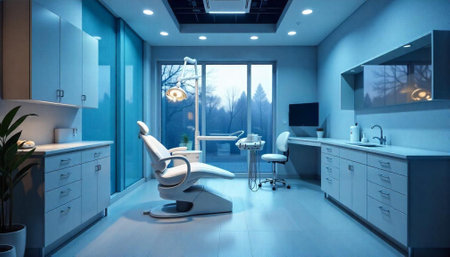 Dentist's office showing equipment, chair, and medical devices in a clean, modern setting, ready for patients